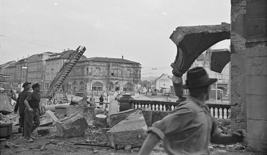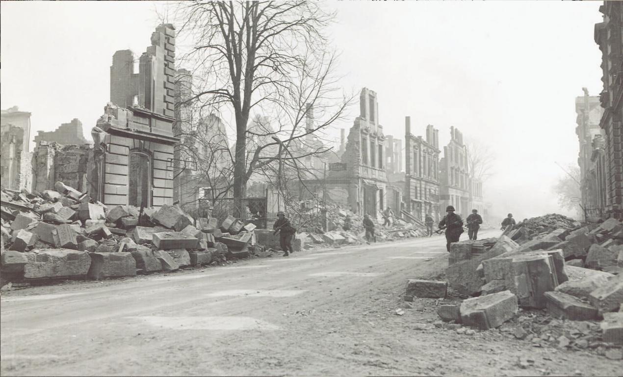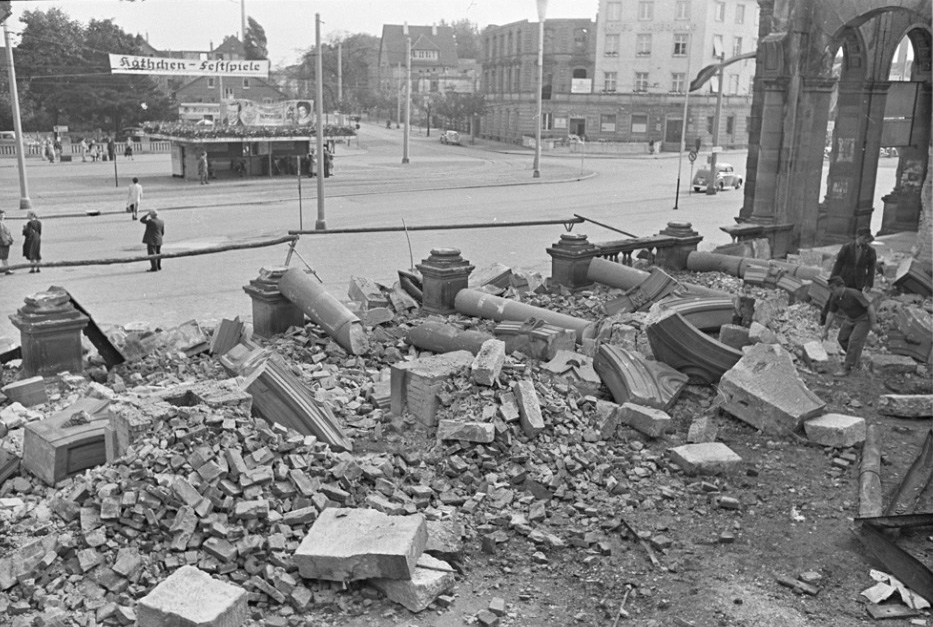 Frankfurterstraße: In den Ruinen fand noch ein erbitterter Häuserkampf statt (21). Am Schild des berühmten Hofmalers Bader (Frankfurterstr. 36a) lässt sich der Straßenabschnitt identifizieren.