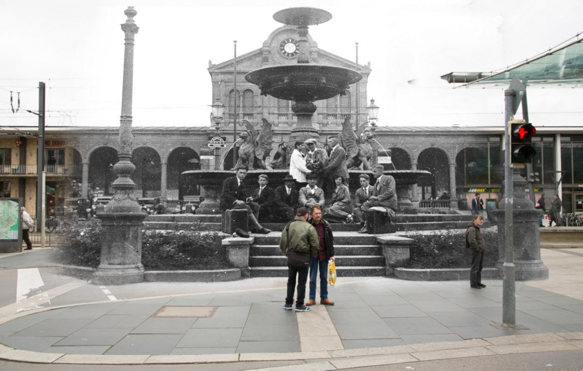 Brunnen vor dem Hauptbahnhof, Fotocollage J. Peter unter Verwendung einer historische Aufnahme von Hubert Herold, StA Hn