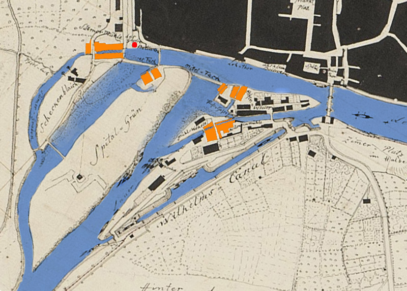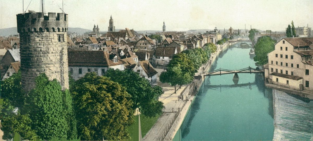 im Jahr 1821: Mühlenbetriebe und Turm am Neckar