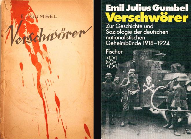 Unten: Originalausgabe aus den 20er Jahren und späterer Reprint eines Buches von E. J. Gumbel