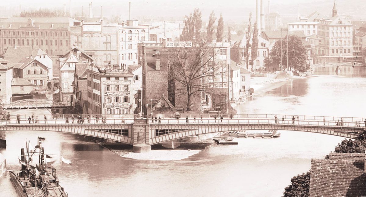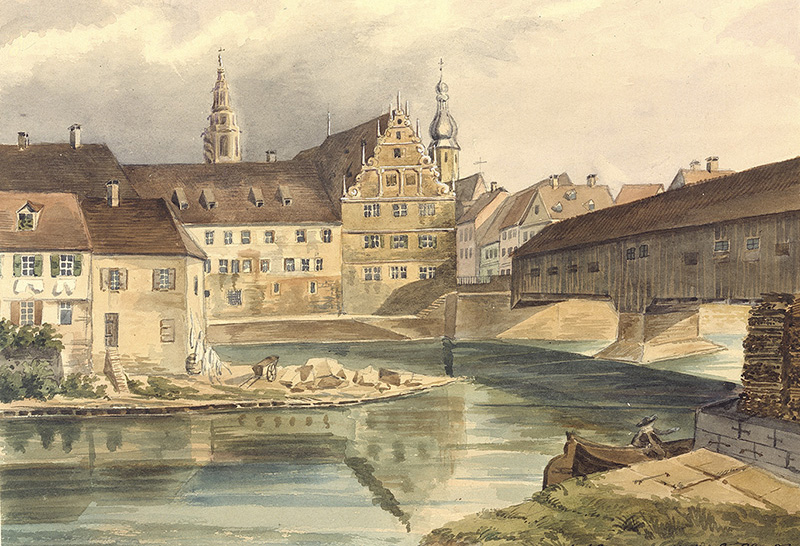 Die alte Steinbrücke (1471-1691) wurde durch Eisgang zerstört. Unten eine Zeichnung von 1691, leicht nachkoloriert.