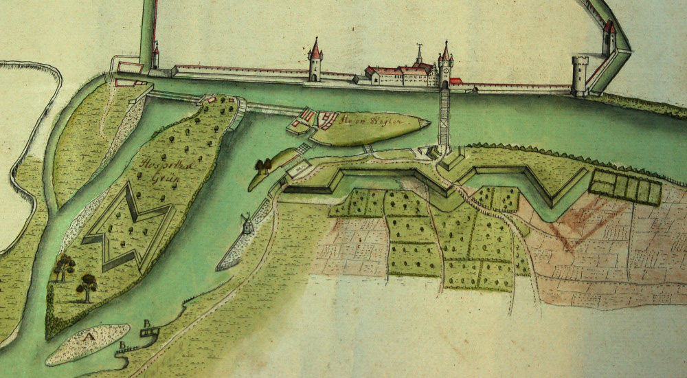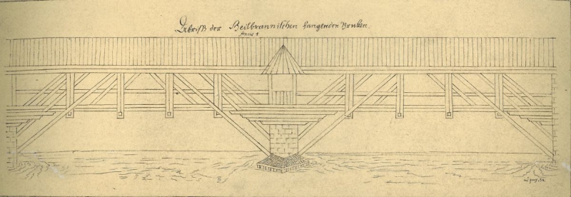 Fast 200 Jahre lang blieb es dann bei einer Holzbrücke (Plan von 1691)